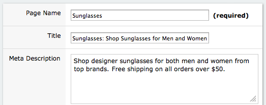 Every page and every product more information page in ShopSite has a field for a page title, page meta keywords and page meta description. Although the meta keywords aren't used much (if at all) by search engines, both the title and meta descriptions are still used for both search engine ranking, as well as are displayed in search engine results. If you do not specify a page or product more information page title, the page name or product name will be used. The page title is displayed in the top of the browser as the title in search results. Below are some guidelines to help you build useful titles and meta descriptions, you can also checkout Google's suggestions for creating Page Titles and Meta Descriptions.
